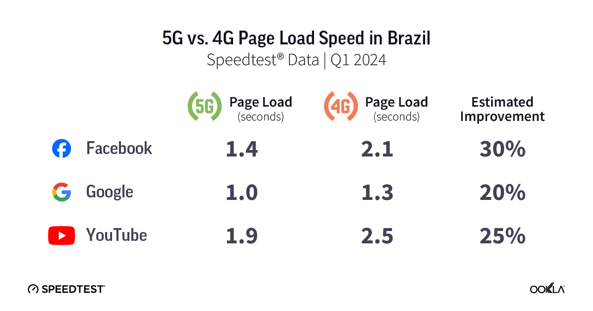Speedtest data shows that 5G delivered a much lower page load speed than 4G on all three services in Brazil during Q1 2024. Google loaded 20% faster on 5G than 4G, YouTube was 25% faster, and Facebook was 30% faster on 5G.