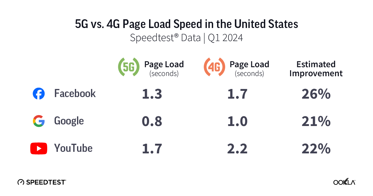 Speedtest data from the U.S. shows 5G delivered a much lower page load speed than 4G on all three services during Q1 2024. Google loaded 21% faster on 5G than 4G, YouTube was 22% faster, and Facebook was 26% faster on 5G.