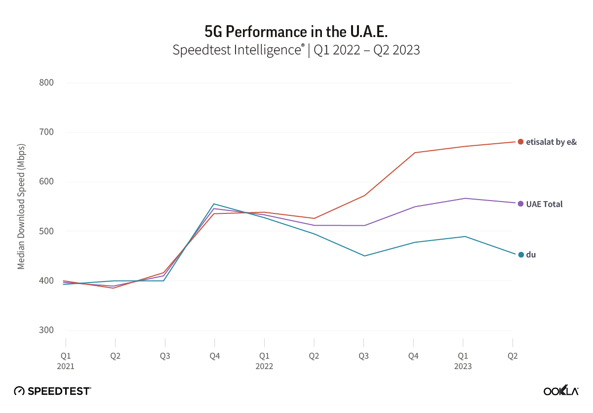 - Top-performing global 5G market and network operator. The U.A.E. was the fastest 5G market globally in Q2 2023 according to OoklaⓇ Speedtest IntelligenceⓇ data, with growing competition between the nation’s two network operators helping to drive overall performance in the market to reach a median download speed of 557.63 Mbps. etisalat by e& was the fastest 5G operator globally with a median download speed of 680.73 Mbps.