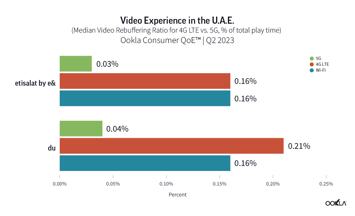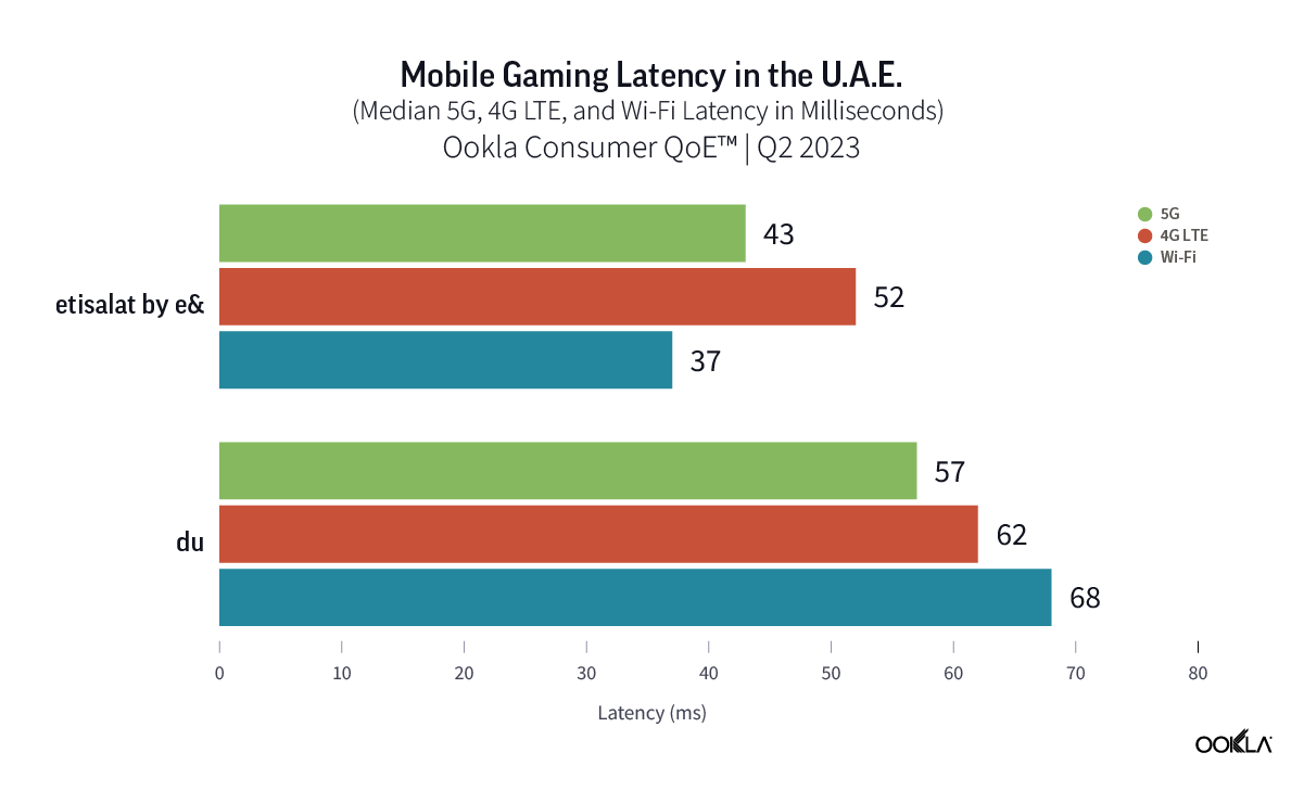 - 5G networks trump 4G-LTE for mobile gaming and video streaming experiences. Users accessing both etisalat by e&’s and du’s 5G networks experienced median gaming latency of 43 ms and 57 ms respectively, lower than those recorded across 4G LTE. 5G users also experienced improved video start times and experienced less buffering when streaming video compared to those on either 4G LTE or Wi-Fi.