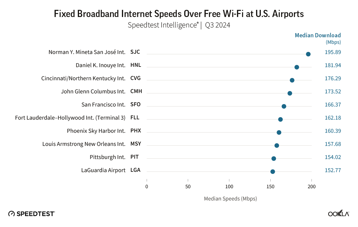 Speedtest Intelligence® shows Norman Y. Mineta San José International Airport, Daniel K. Inouye International Airport, and Cincinnati/Northern Kentucky International Airport were once again home to some of the fastest free airport Wi-Fi among the country’s busiest airports, with median download speeds of 195.89 Mbps (down from 259.37 Mbps last year), 181.94 Mbps (down from 187.58 Mbps), and 176.29 Mbps (down from 210.09 Mbps), respectively, during Q3 2024.