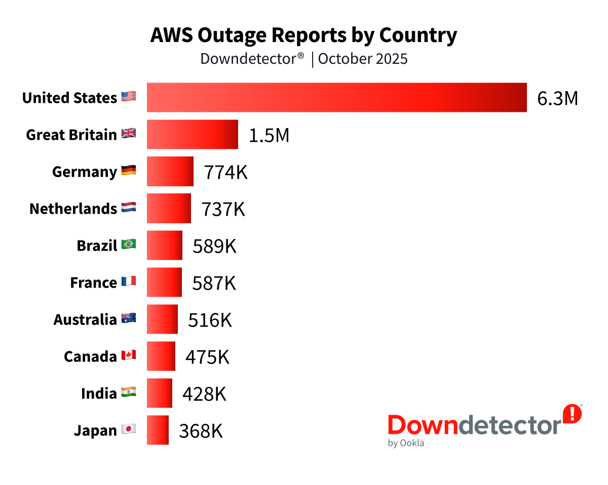 Downdetector captured 17M+ global user reports from 00:00 UTC on Oct 20 to 09:15 UTC on Oct 21, with 3,500+ of the companies Downdetector tracks seeing elevated disruptions and 19 still ongoing the following morning. Country volumes were led by the US (6.3M+), UK (1.5M+), Germany (774k), Netherlands (737k) and Brazil (589k).