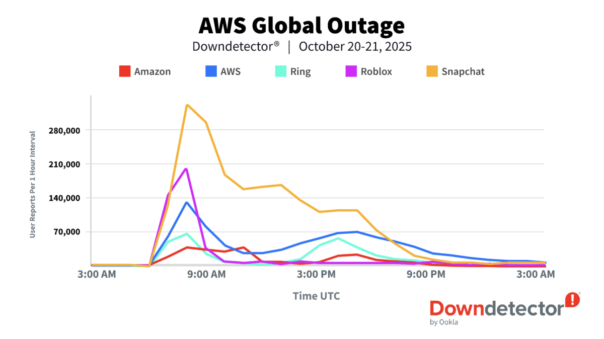 The heaviest‑hit services by report count included Snapchat (~3M), AWS itself (~2.5M), Roblox (~716k), Amazon retail (~698k), Reddit (~397k), Ring (~357k) and Instructure (~265k). The UK alone generated more than 1.5M reports, far exceeding a typical day’s ~1M global baseline across all markets, highlighting both the unique intensity and breadth of this event.