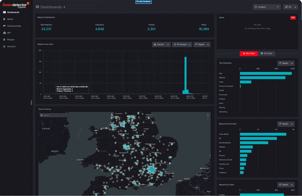 Downdetector Explorer leverages the power of crowdsourced data on Downdetector.com to identify outages and disruptions in real-time for various online services, such as websites, apps, and cloud services. It harnesses the collective input of millions of users worldwide to provide real-time status and outage information for thousands of services, giving service providers valuable insights to resolve issues quickly and efficiently.