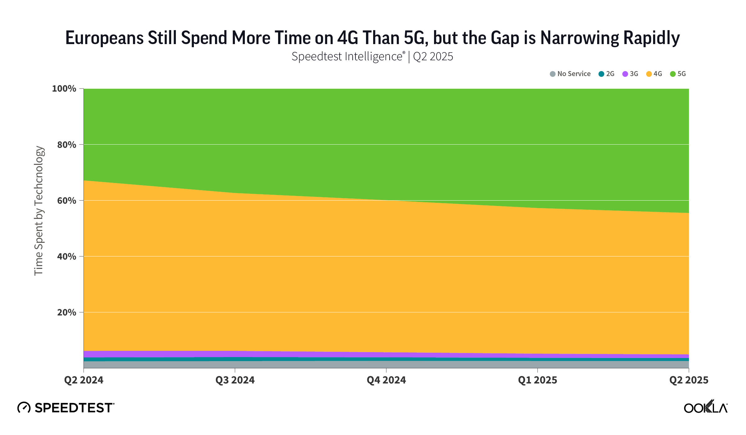 - Europe’s 5G rollout has produced a “two-speed” competitiveness landscape, with some countries surging ahead in deployment while others fall behind. In Q2 2025, Nordic and Southern European countries maintained a substantial lead in 5G Availability, fueled by recent 700 MHz band deployments that drove double-digit coverage gains in countries such as Sweden and Italy. By contrast, 5G Availability in Central and Western European laggards such as Belgium, the United Kingdom, and Hungary remains less than half that of the leaders. On average, EU mobile subscribers spent 44.5% of their time connected to 5G networks in Q2 2025, up from 32.8% a year earlier.