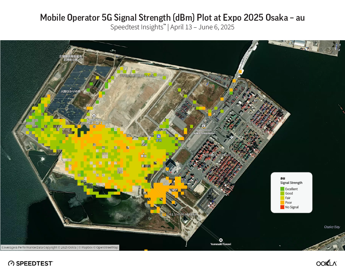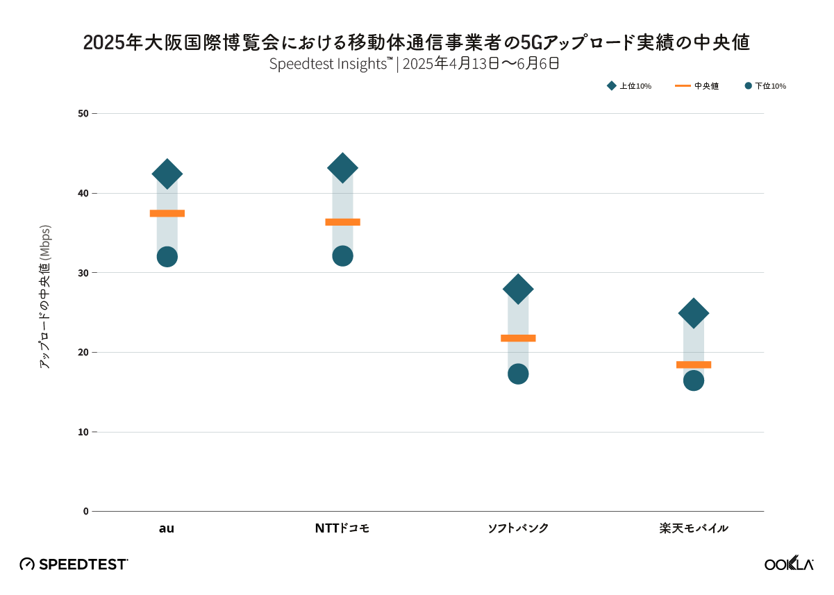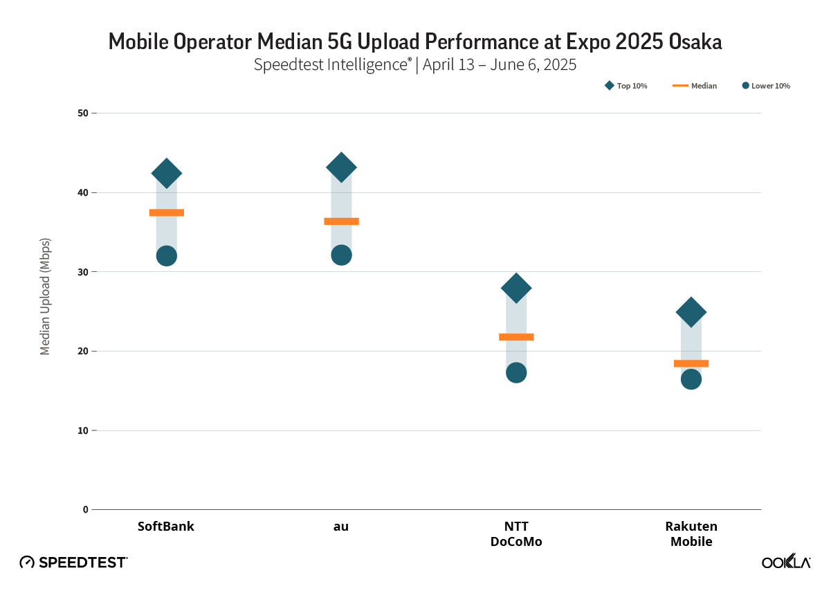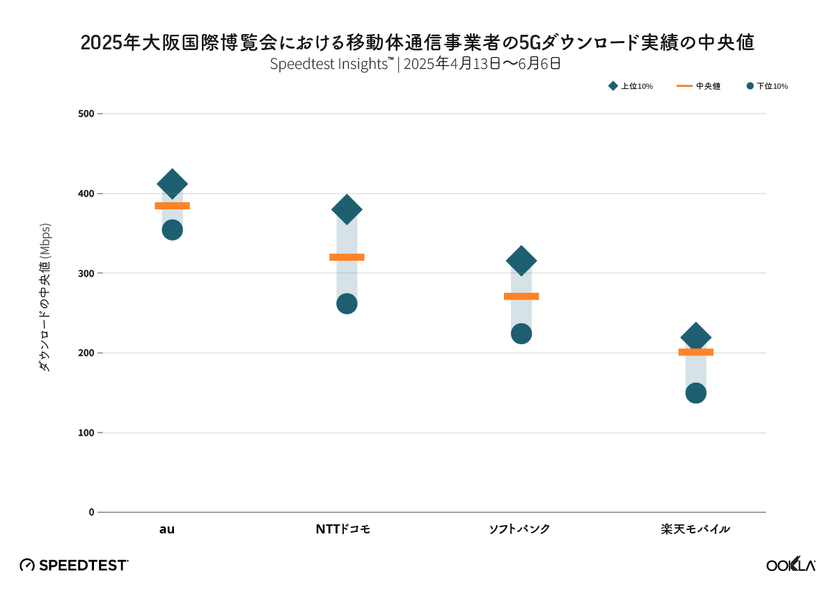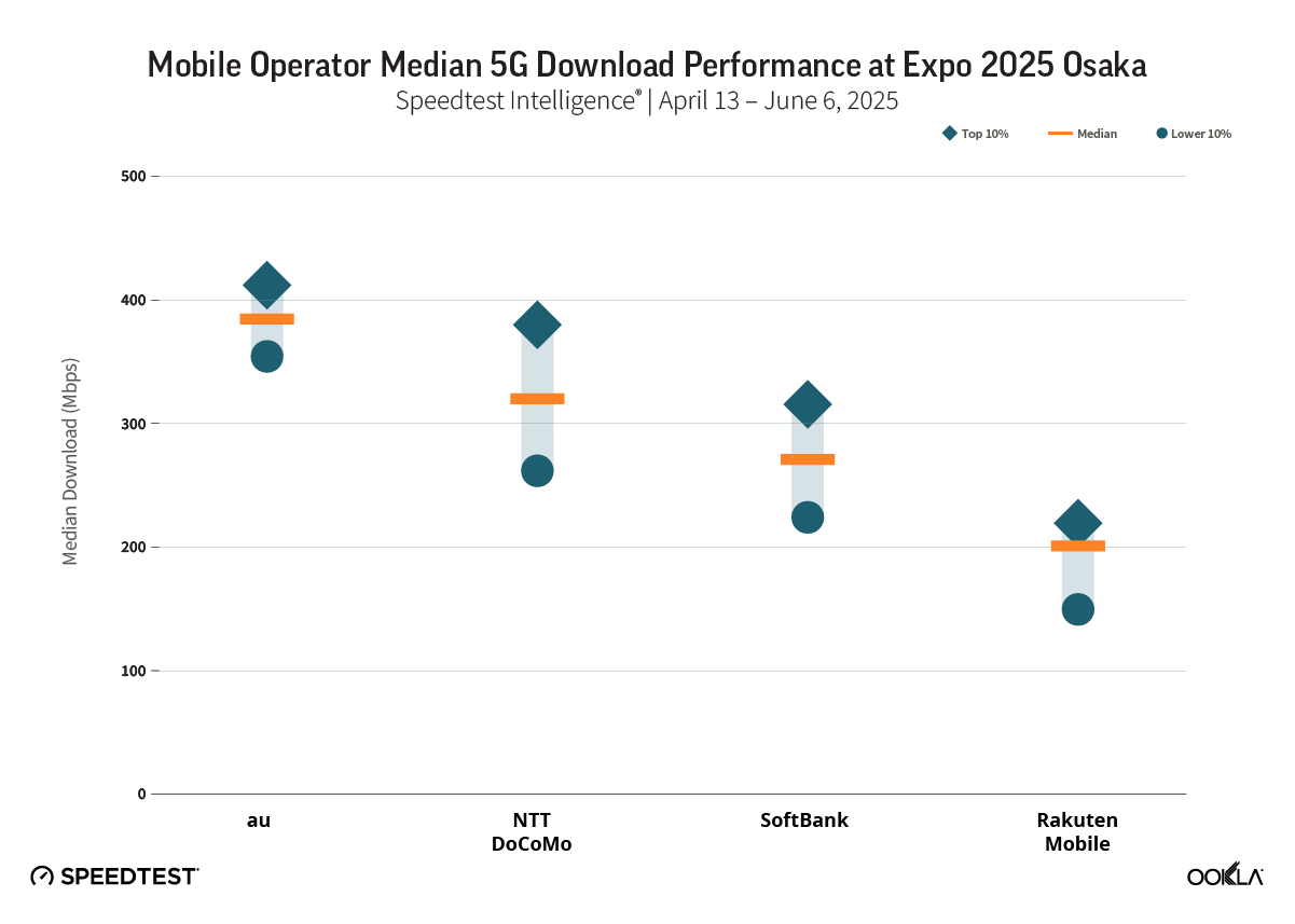 2025年4月13日から6月6日までに収集 Speedtest Intelligence® データに基づくと、auは万博期間中、日本の主要通信事業者の中で最速の5Gパフォーマンスを達成しました。 このオペレーターは、ダウンロード速度の中央値384.68 Mbpsを記録し、下位10%のユーザーは引き続き354.34 Mbpsを達成し、上位10%は411.94 Mbpsに達しました。 すべてのユーザーパーセンタイルでこの一貫性は、強力なネットワーク容量と、イベントサイト全体での5G展開が最適化されていることを反映しています。