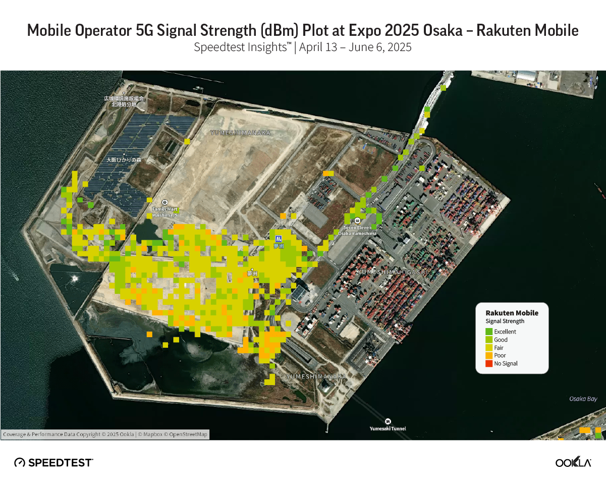 Using data from Speedtest Insights™, collected from April 13 to June 6, 2025, we evaluated the Expo visitor’s 5G experience by measuring the average Reference Signal Received Power (RSRP) and Reference Signal Received Quality (RSRQ). RSRP represents the network signal strength received by a mobile phone. An RSRP value stronger than -80 dBm indicates superior coverage. Measurements between -80 dBm and -90 dBm represent good coverage, while those from -90 dBm to -100 dBm are considered fair coverage. Below this range, expect slower download speeds and potential network disconnections. RSRQ is a metric used to evaluate the quality of the reference signal received by a device. A value of -10 dB or higher indicates excellent network quality while a value between -10 dB and -15 dB is considered good. An RSRQ value lower than -15 dB is poor or indicates no signal at all.