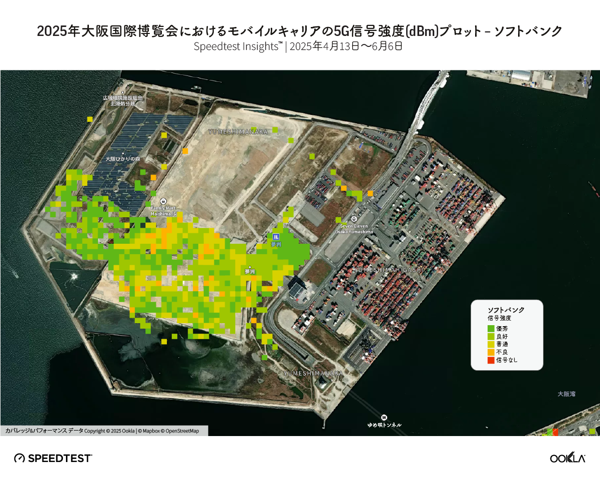 2025年4月13日から6月6日までに収集された Speedtest Insights™ のデータを使用して、平均基準信号受信電力 (RSRP) と基準信号受信品質 (RSRQ) を測定することにより、博覧会の訪問者の5Gエクスペリエンスを評価しました。 RSRPは、携帯電話が受信するネットワーク信号強度を表します。 RSRP値が -80 dBmより強い場合は、カバレッジが優れていることを示します。 -80 dBmから -90 dBmまでの測定値は良好なカバレッジを表し、-90 dBmから -100 dBmまでの測定値は適切なカバレッジと見なされます。 この範囲を下回ると、ダウンロード速度が遅くなり、ネットワークが切断される可能性があります。 RSRQは、デバイスが受信した基準信号の品質を評価するために使用されるメトリックです。 -10 dB以上の値は優れたネットワーク品質を示し、-10 dBから -15 dBの値は良好と見なされます。 RSRQ値が -15 dB未満の場合、信号品質が悪いか、信号がまったくないことを意味します。