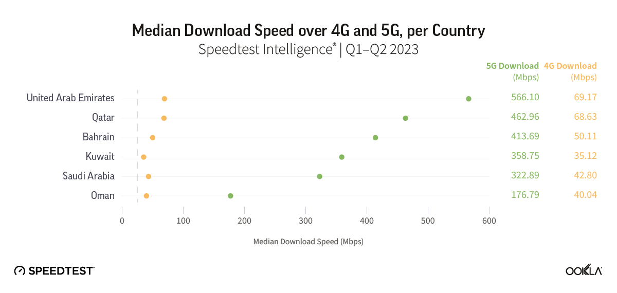 U.A.E. offers the fastest median download speeds for both 4G and 5G at 69.17 Mbps and 566.10 Mbps, respectively, ahead of Qatar and Bahrain which rounded out the top 3 in the region. 5G offers significantly better performance than 4G in all markets. The median 5G speed across Gulf countries was 6.8X faster than the median 4G speed (345.53 Mbps vs. 43.9 Mbps).