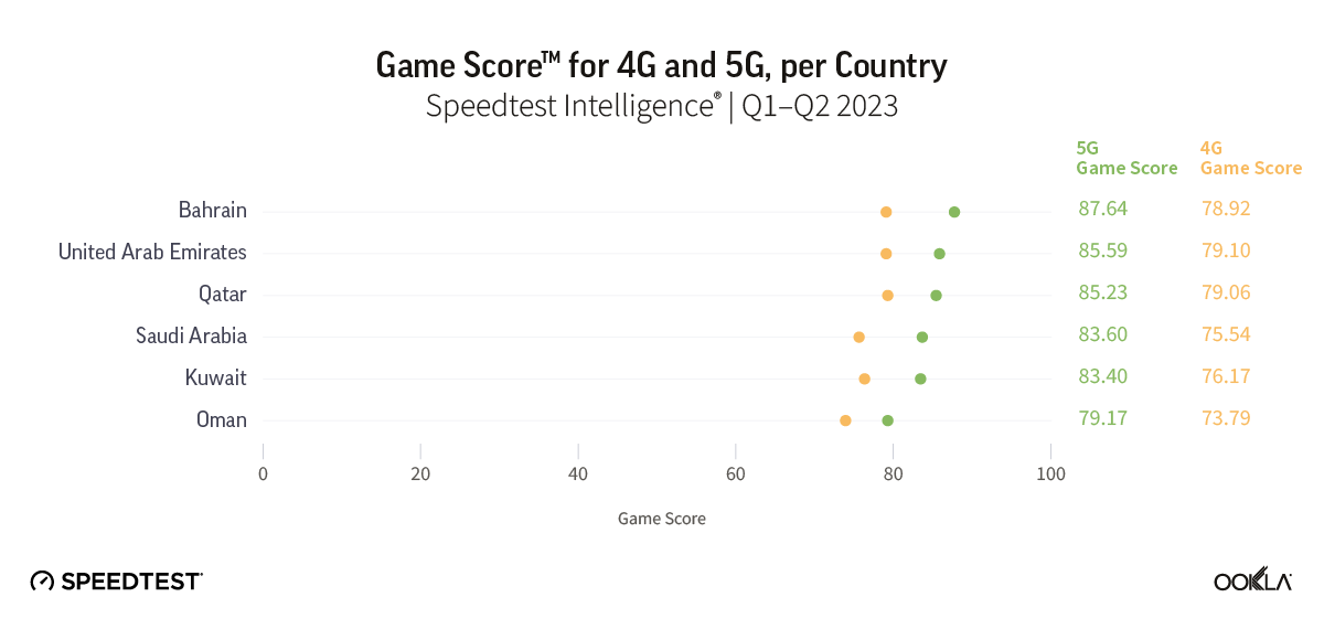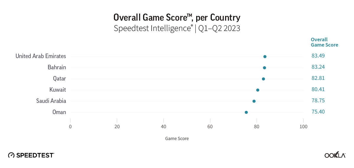 The U.A.E., Bahrain, and Qatar had the highest Game Scores during the first half of 2023 in the Middle East. That means that users in these countries get the best mobile gaming experience in the region. The U.A.E. is home to the fastest 5G operator globally in Q2 2023, according to Ookla Speedtest Intelligence™ data. The U.A.E. comes first with a Game Score of 83.49 on a 100-point scale (considering all mobile technologies). The U.A.E. was closely followed by Bahrain with a score of 83.24 and Qatar with a score of 82.81. These results reflect the superior mobile network performance in these three markets which helps to deliver a good gaming experience. Kuwait, Saudi Arabia, and Oman were further down the Game Score ranking, achieving scores of 80.41, 78.74, and 75.40, respectively.