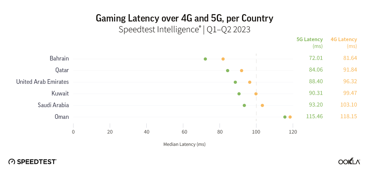 Ookla’s data shows that most countries, except Oman, recorded latency below 100 ms on 5G. Bahrain had the lowest latency on 5G at 72.01 ms, and Oman had the highest latency at 115.46 ms. Saudi Arabia and Kuwait also had a relatively high 5G latency at 93.2 ms and 90.31 ms, respectively, which means that some multiplayer shooters, racing, fighting, and multiplayer online battle arena (MOBA) games might have a noticeable lag. Operators have room to improve the conditions for multiplayer games, especially for competitive gamers.