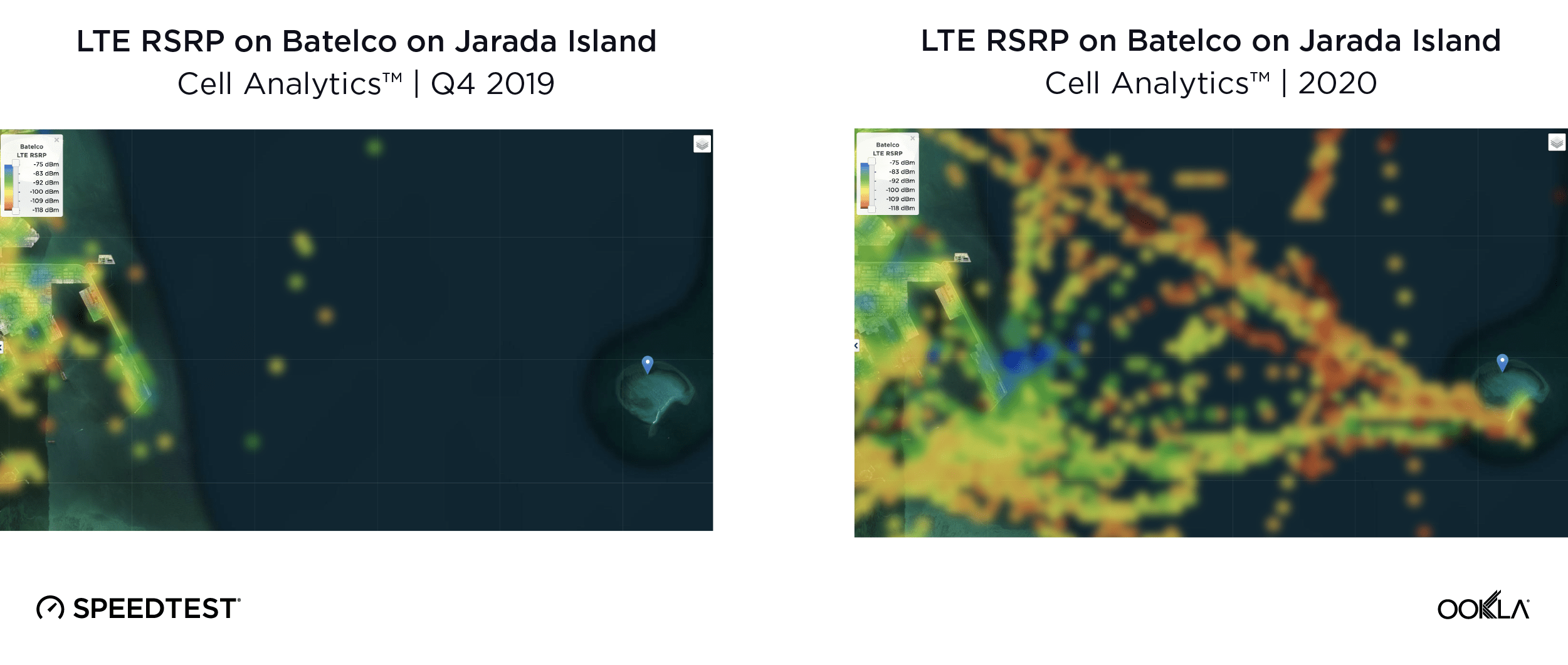 Jarada Island is indicated by the blue pin on the right side in the above images. In Q4 2019 there was no mobile coverage along the coast or anywhere in the open water near Jarada island. Over the following 12 months, Batelco improved the range and quality of their radio coverage to become the first mobile provider offering coverage both en route across the sea and on the island itself. The team used Cell Analytics to validate their coverage on the Island and continue to monitor their network performance there.