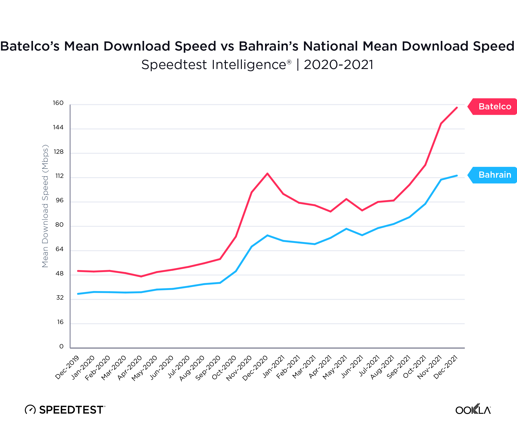 Batelco’s mean download speed continued to increase throughout 2021, which consistently lifted Bahrain’s national average download speed.