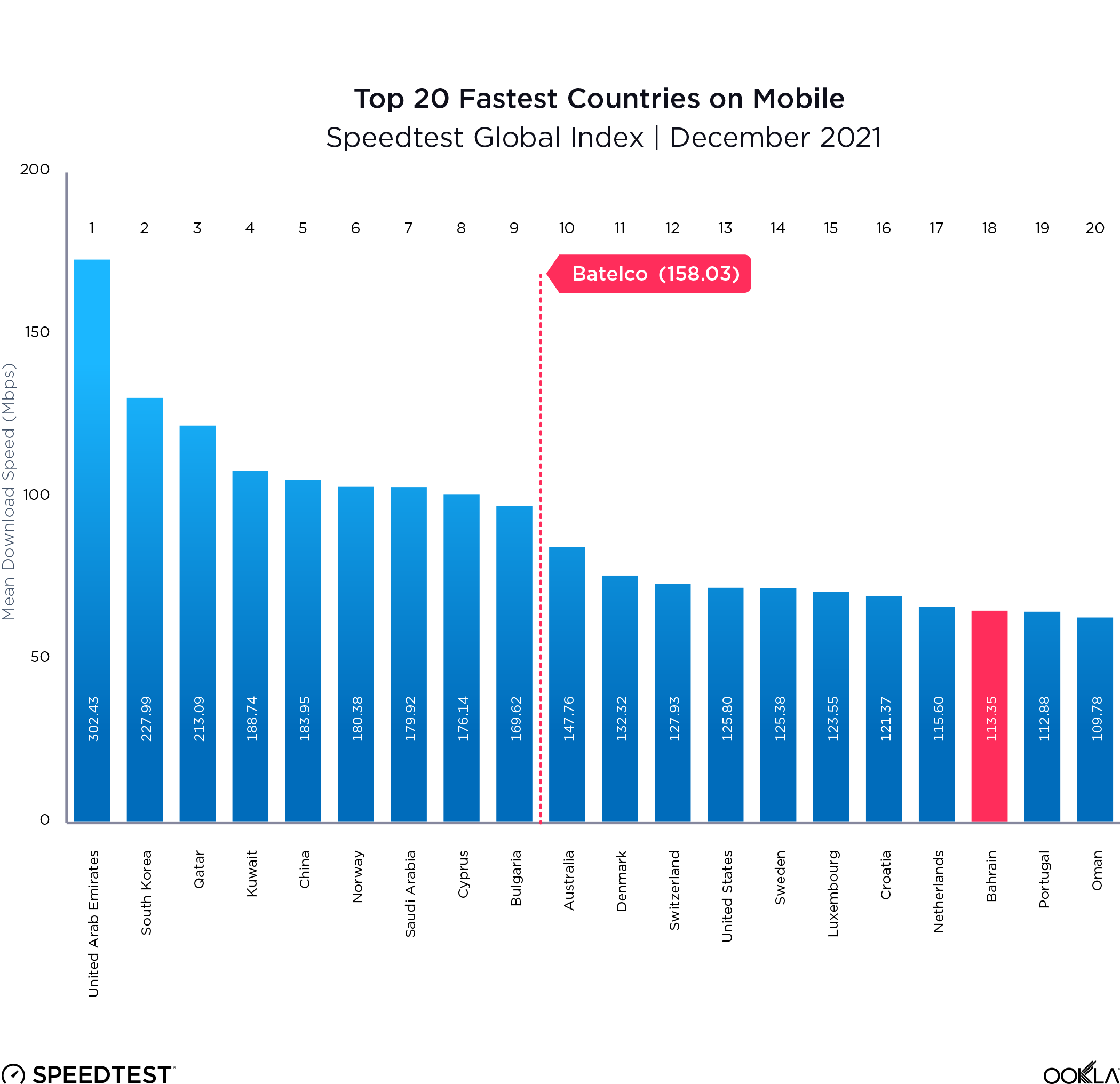 Bahrain ended 2021 ranked as the 18th fastest nation in the world, heavily impacted by Batelco’s mean download speed of 158.03 Mbps in December 2021.
