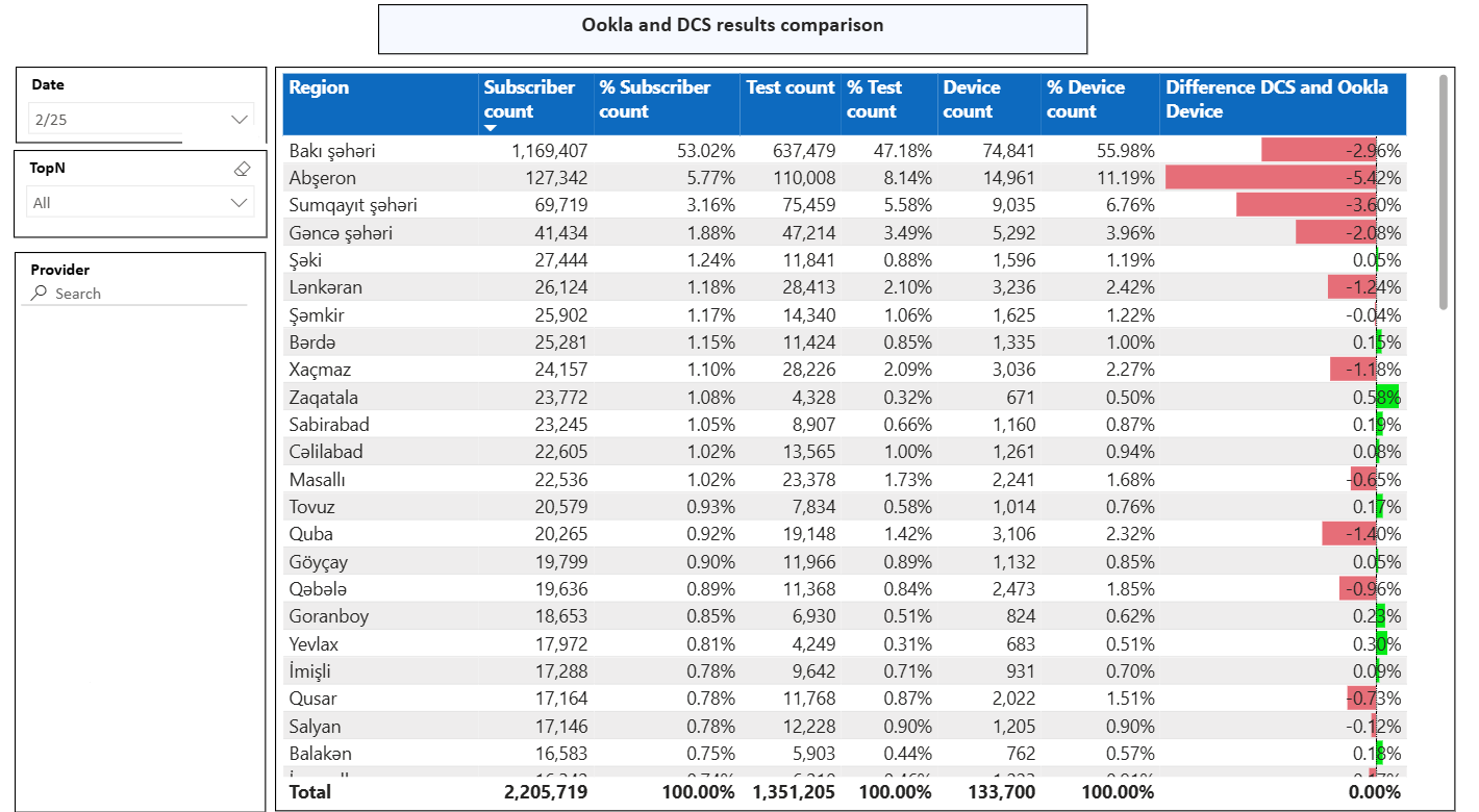 To address the core challenges of performance tracking, declaration validation, and strategic targeting, ICTA developed a unified approach using Ookla Speedtest data and internally built Power BI dashboards. Rather than relying on off-the-shelf solutions, the agency designed custom tools tailored to Azerbaijan’s regulatory needs.