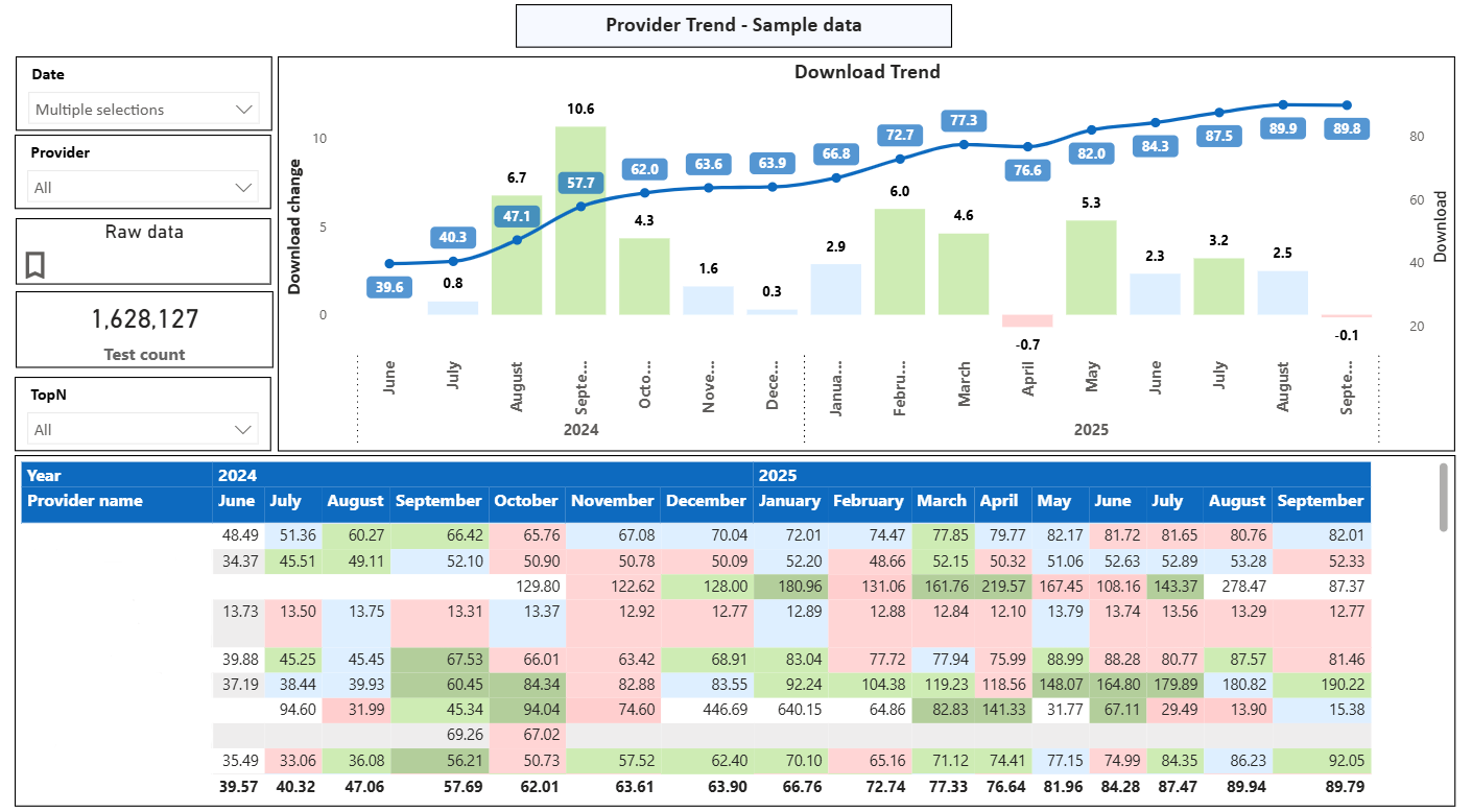- Improved Regulatory Oversight: With month-by-month tracking of ISP download speeds, regulators can monitor trends, evaluate the impact of policy or market shifts, and spotlight top and underperforming ISPs. This visibility incentivizes providers to improve performance in alignment with public expectations.