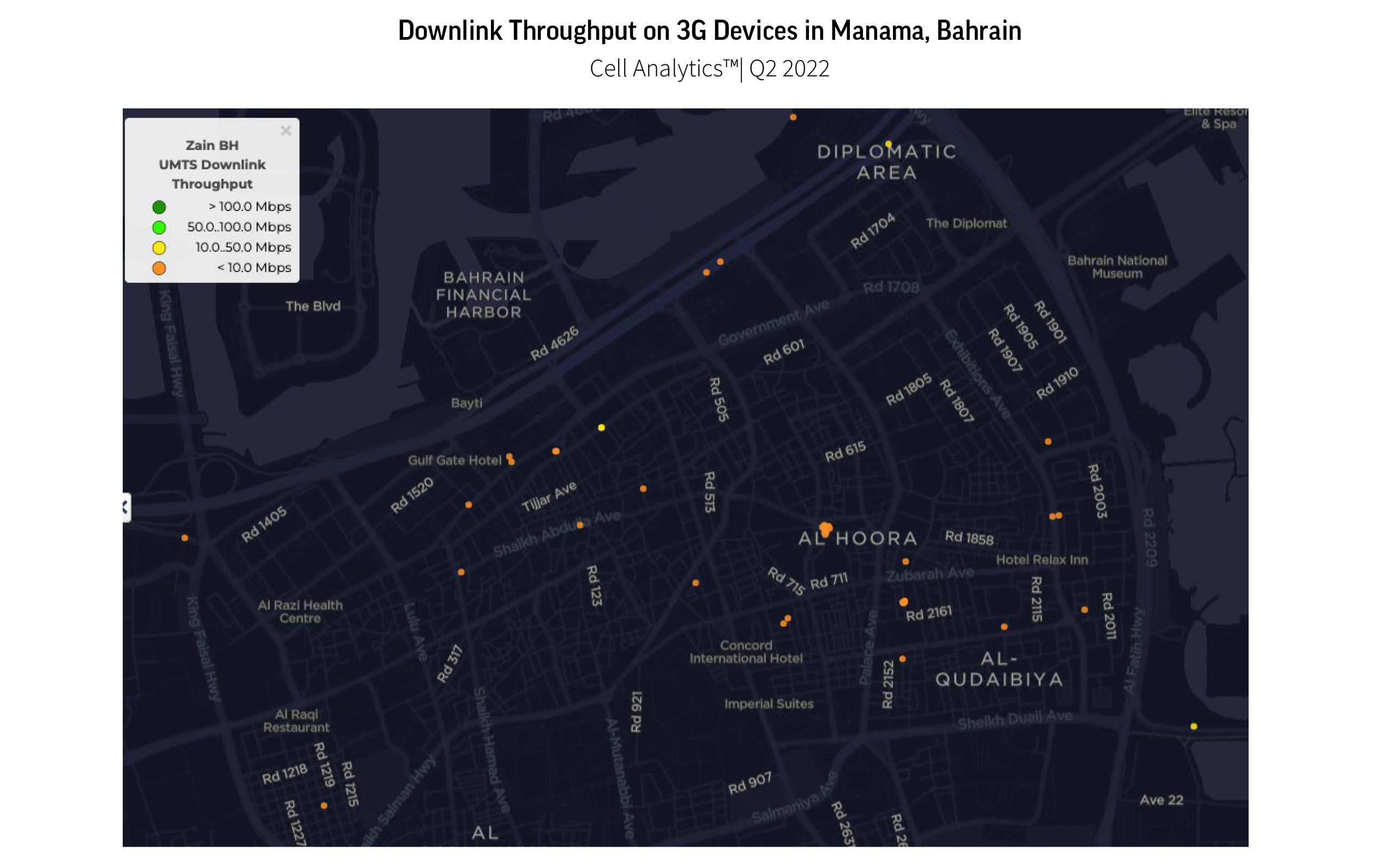 Using crowdsourced network intelligence in Cell Analytics, Zain Bahrain was able to find out where customers were still relying on 3G — down to where subscribers have user equipment that can’t connect to modern network technology. Looking at downlink throughput on 3G Devices in Bahrain during Q2 2022, we can see that there was a concentration of 3G users in the capital city of Manama.