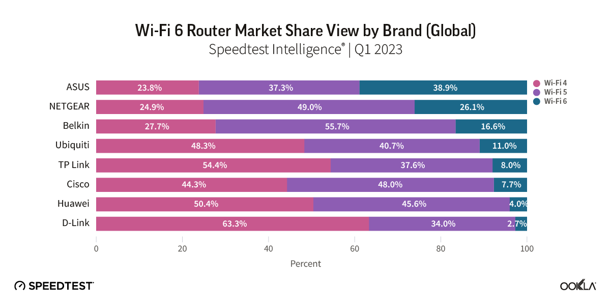 - Router vendors pushing the envelope with Wi-Fi 7 capable launches. ASUS leads the market for Wi-Fi 6/6E routers among Speedtest samples, and both ASUS and other leading router vendors have been quick to launch Wi-Fi 7 capable routers. Despite this, Wi-Fi 6 and 6E remain the growing component of their installed bases. ASUS leads the market according to Speedtest Intelligence with 39% of its routers we sampled supporting Wi-Fi 6/6E during Q1 2023, well ahead of second placed NETGEAR with 26%.