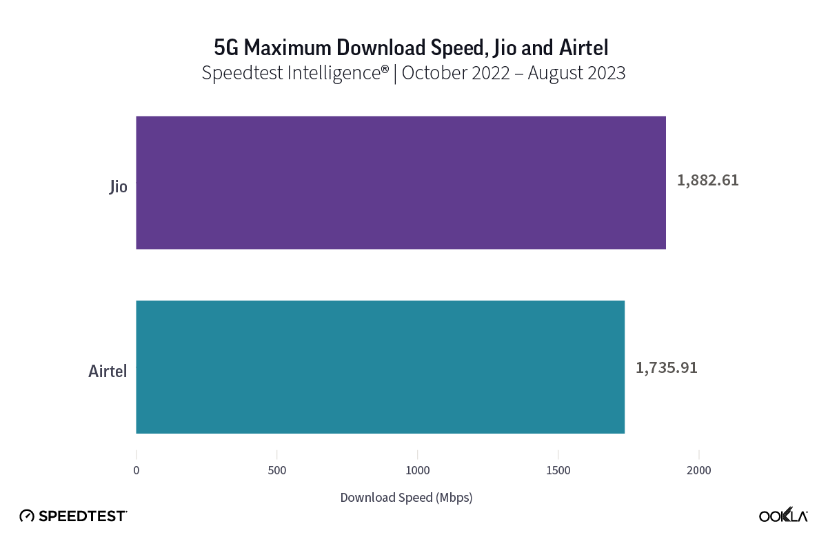 Median 5G performance allows us to understand the midpoint of the user experience on 5G networks, but it doesn’t paint the complete picture. Speedtest® is designed to thoroughly saturate a user’s connection, uniquely allowing us to accurately measure the maximum speeds available. This is especially important for 5G connections, which can be capable of tremendous speeds, such as those we observed in India. Using Speedtest data, we can see that operators in India have already achieved maximum download speeds exceeding 1.7 Gbps. Speedtest simultaneously measures download speeds from multiple servers to ensure a fully utilized connection.
