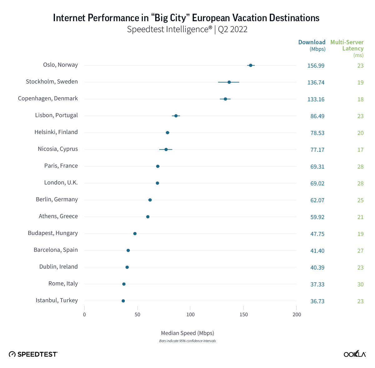 Oslo, Norway topped our list of 15 European vacation destinations full of big city excitement with the fastest mobile internet with a median download speed of 156.99 Mbps during Q2 2022. Perfect if you’re planning to do live updates from the Øya Festival. Two other Nordic cities rounded out the top three with Stockholm, Sweden showing a median download speed of 136.74 Mbps and Copenhagen, Denmark coming in at 133.16 Mbps. With speeds like these you should be able to host as many “see how glorious my vacation is?” video calls as you want.