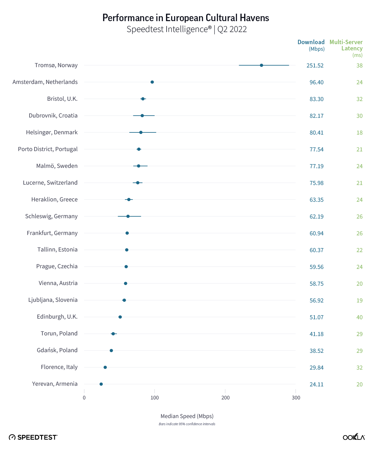 Travelers looking for maximum culture and fast internet speeds can do no better than Tromsø, Norway, which had a median download speed on mobile of 251.52 Mbps during Q2 2022, almost 2.3x faster than runner-up Amsterdam, Netherlands. Whether you’ve traveled to the northernmost bit of Norway for the wooden houses, one of the many summer festivals, or just to escape the heat, you’ll have fast enough internet to thoroughly research all the places you can go if you extend your vacation.