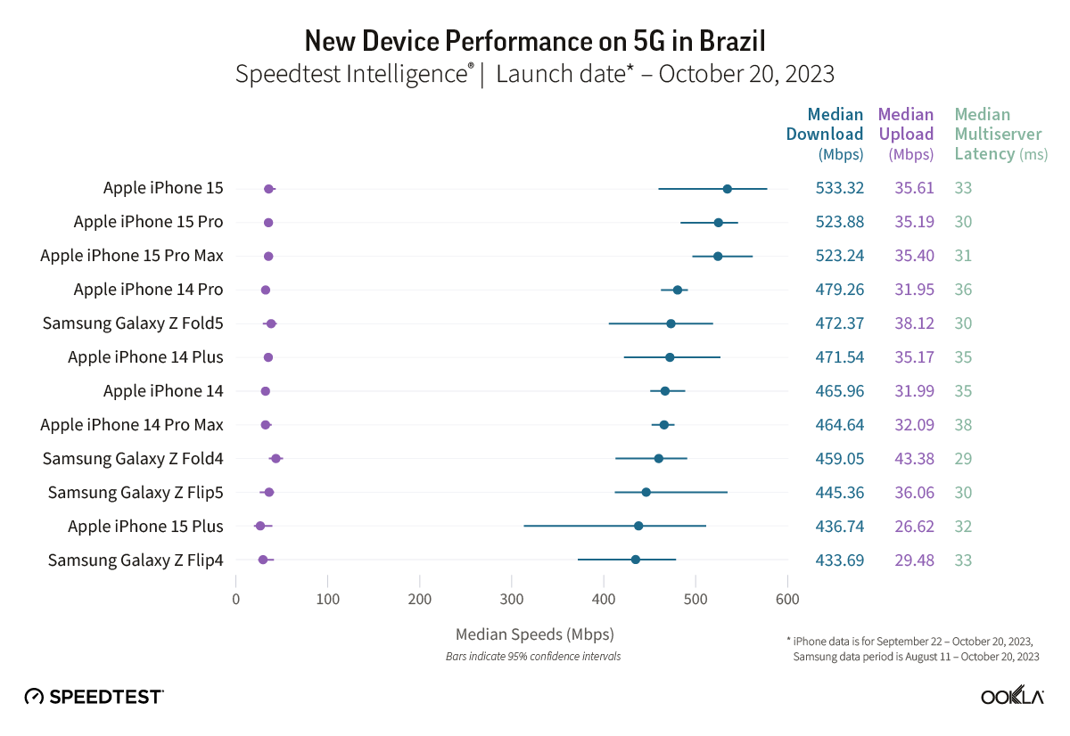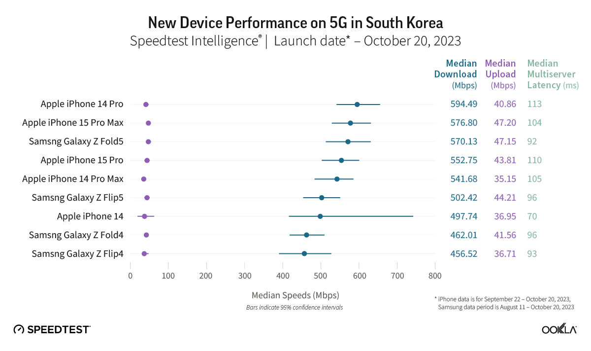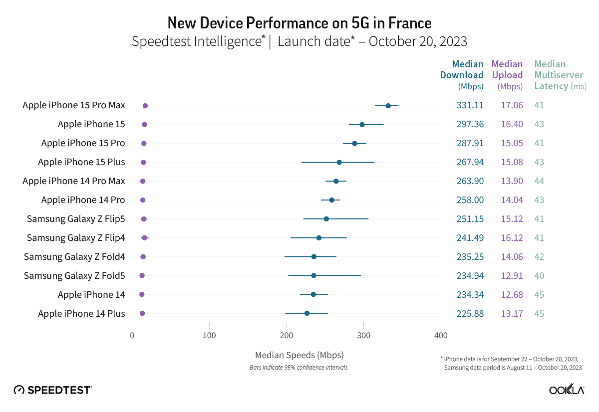 Data for iPhone models is provided for the period from September 22-October 20, 2023, while data for the Samsung models is for the period from August 11-October 20, 2023. Keep in mind that device data differs across markets due to a variety of factors, including: 5G investments by governments and mobile operators, different 5G spectrum allocations, and mobile 5G plans. As many of these devices are very new, the sample counts in some countries are still low so the statistical ranges of expected performance are wider for the newer devices than the older models.