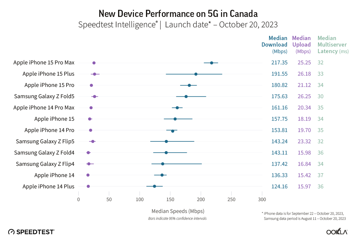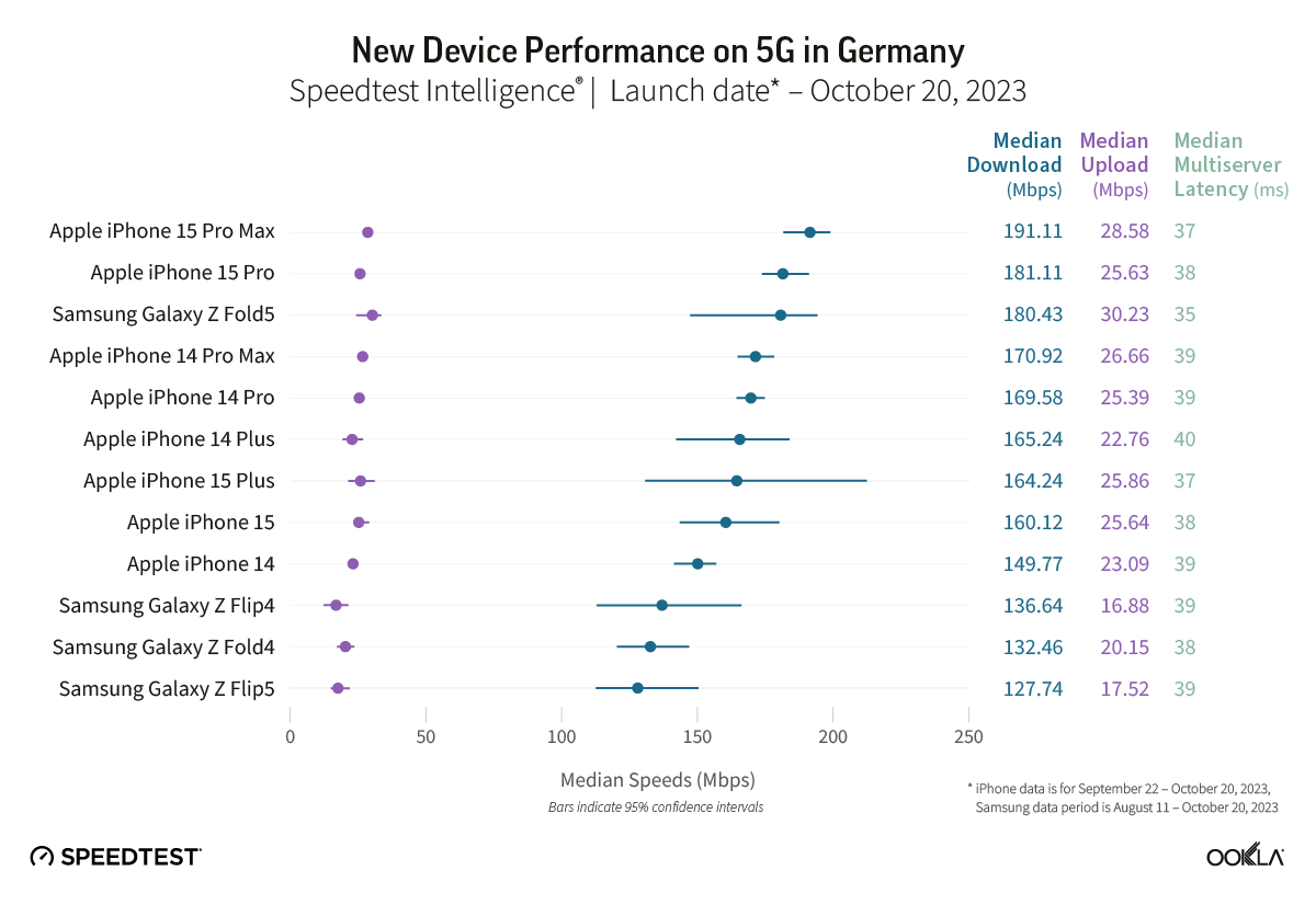 To upgrade or not to upgrade, with Black Friday and Cyber Monday deals on the latest iPhone and Samsung devices on the horizon you may be asking yourself just that question. We analyzed data from Speedtest Intelligence® in 13 major markets to see how well the Apple iPhone 15 devices and the Samsung Galaxy Z Fold5 and Flip5 models are performing in comparison to last year’s models over 5G to help you make an informed decision. For details on performance by Samsung Galaxy S23 models, read our analysis from earlier this year. We’re especially interested in seeing if technical improvements on iPhone 15 models including support for WiFi 6E drive better performance.