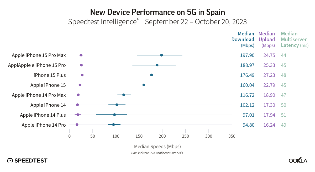 Three iPhone 15 models in Spain showed median 5G download speeds that were significantly faster than their iPhone 14 equivalents during the September 22-October 20, 2023 period, and the improvements in performance were mostly greater than we saw in other countries, with the exception of the United States. Speedtest Intelligence reveals the iPhone 15 Pro had a 40% better download speed than the iPhone 14 Pro, the iPhone 15 Pro Max had a 36% better download speed than the iPhone 14 Pro Max, and the iPhone 15 had an 11% better download speed than the iPhone 14. There were not enough samples to properly assess the performance of the iPhone Plus.