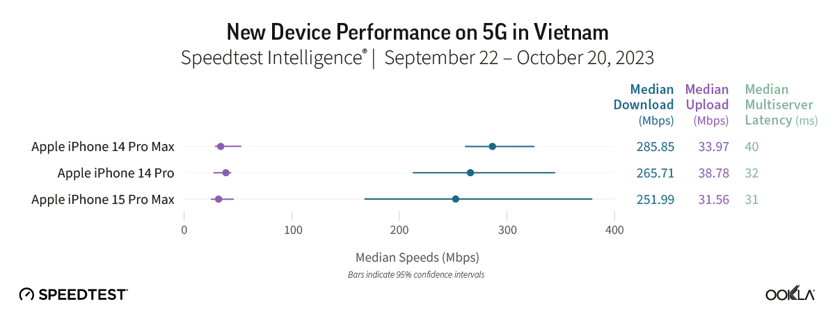 The iPhone 15 Pro Max did not have a statistically better median download speed over 5G than the iPhone 14 Pro Max during the September 22-October 20, 2023 period in Vietnam. There were not enough samples to properly assess the performance of the other three iPhone models. Likewise, there were not enough samples to evaluate the Galaxy Z Flip or the Galaxy Z Fold.