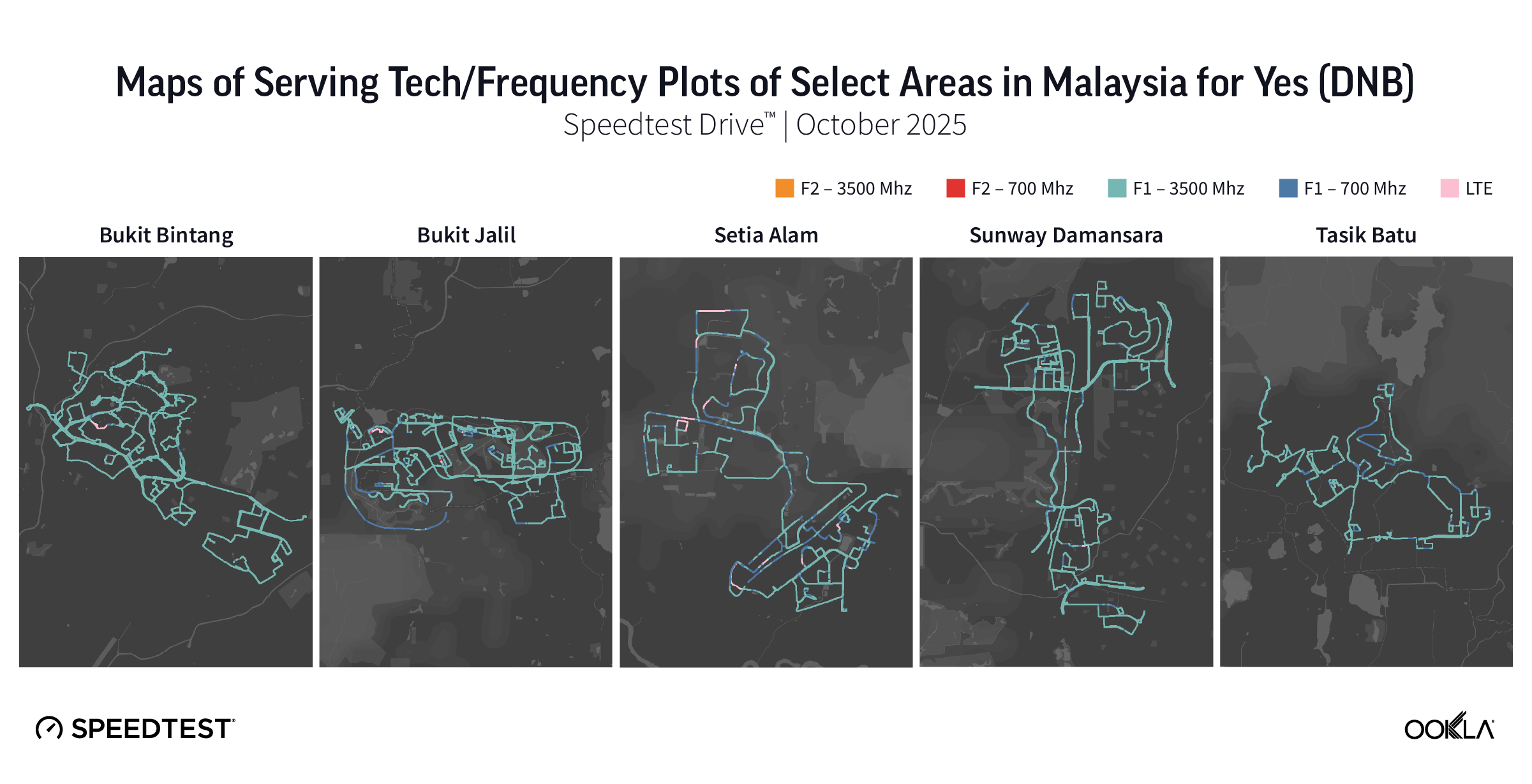 To assess the end-user’s real-world 5G mobile experience under this structure, Ookla® used the Speedtest Drive™ controlled network testing methodology in October 2025. The testing focused on five primary clusters within the Klang Valley—Bukit Bintang, Bukit Jalil, Sunway Damansara, Tasik Batu, and Setia Alam. The controlled testing team was equipped with the latest 5G-capable handsets featuring SIM cards from major operators in the country. Among the five operators included, both Yes and U Mobile are currently implementing 5G Standalone (5G SA) technology. Yes delivers 5G SA services via the DNB infrastructure, integrating its own 5G Core. In contrast, U Mobile employs a dual strategy: it leverages the DNB network for base coverage while rapidly deploying its own second 5G network, which is fully 5G SA by design.