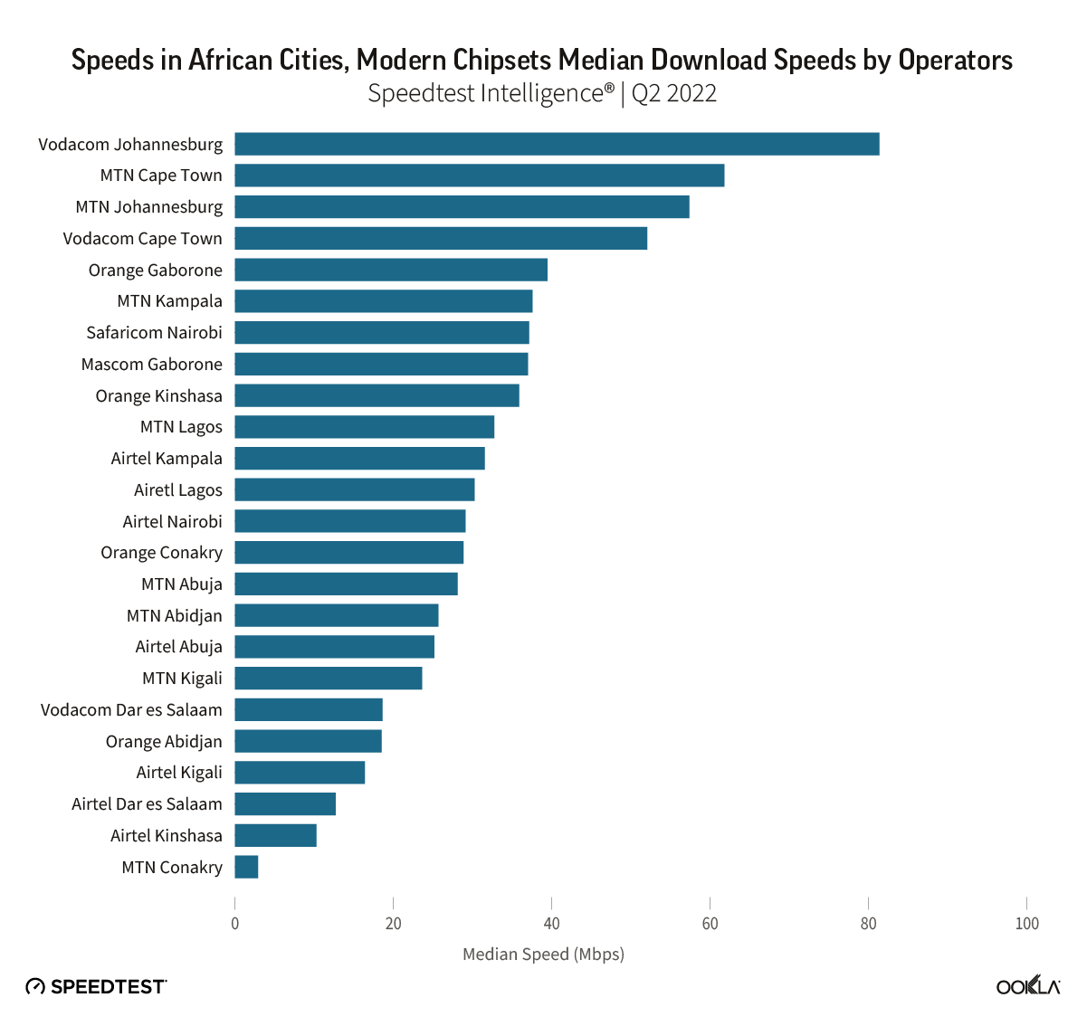 - Speedtest Intelligence® data shows that MTN South Africa delivered the fastest median download speeds across analyzed operators, at 65.95 Mbps in Q2 2022. However, Vodacom in Johannesburg was the fastest operator considering speeds across top cities, reaching 81.36 Mbps median download speed in Q2 2022. In South Africa, MTN outperformed Vodacom in terms of median mobile speeds during Q2 2022.