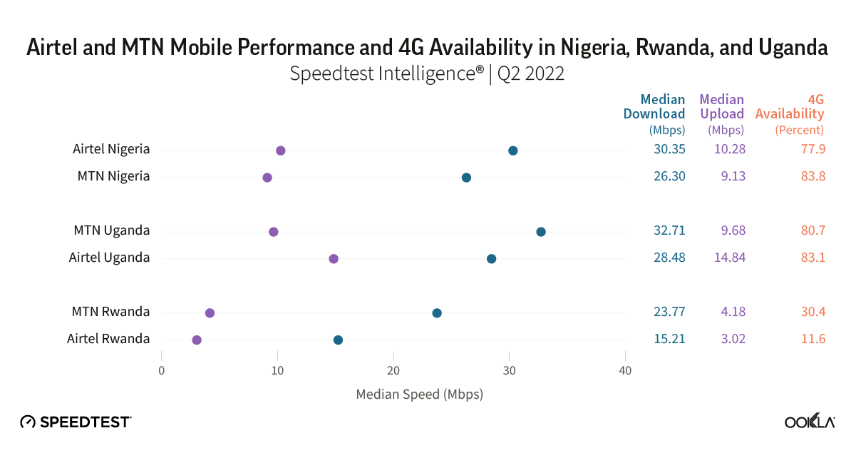 - Comparing Airtel and MTN performance across the three countries they operate in, Airtel took the top spot in Nigeria, both in terms of median download and upload speed in Q2 2022, while in Uganda and Rwanda there were no winners. Such was the case in Botswana too, where there was no winner between Mascom and Orange.