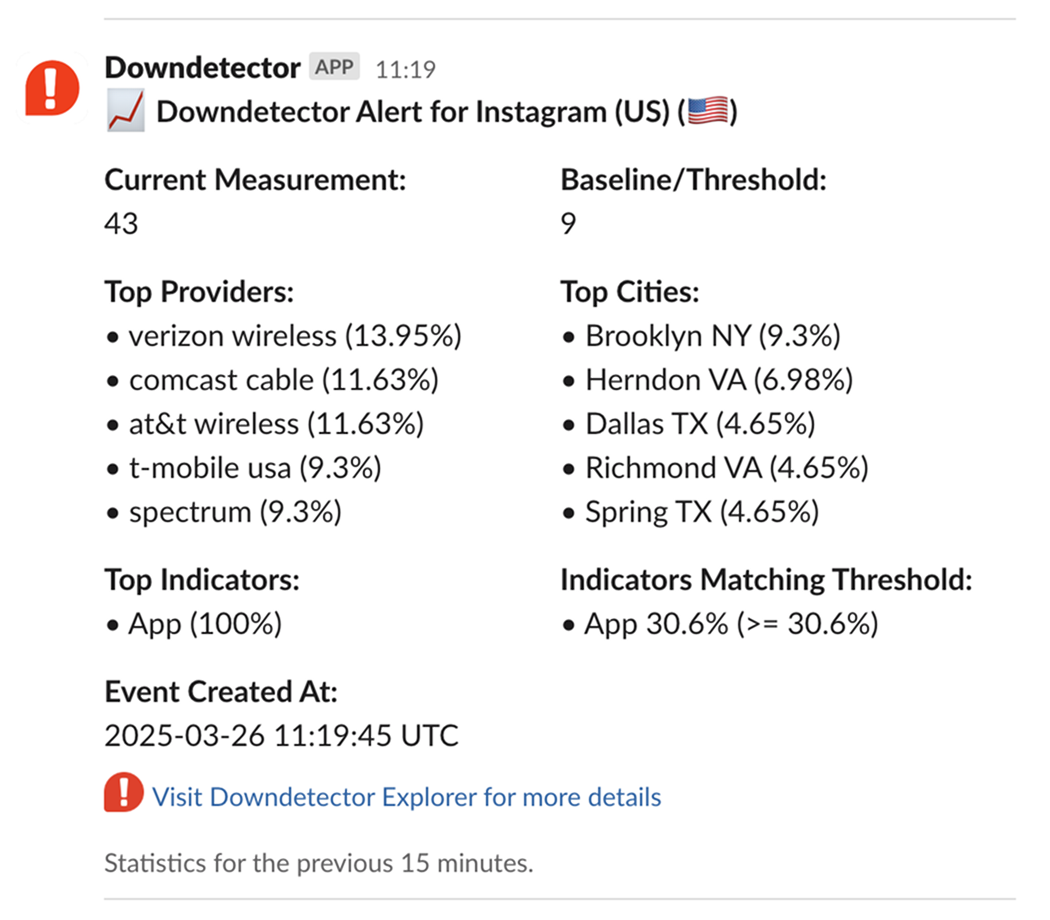 Here’s a look at what a Downdetector alert looks like in Slack: