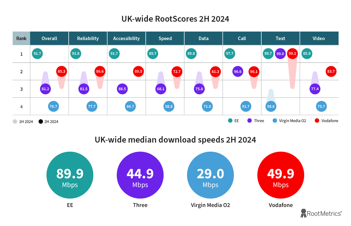 In the second half of 2024, RootMetrics conducted over 625,000 tests to measure the real-world mobile performance of mobile operators in the United Kingdom. The following report provides a comprehensive picture of network performance at the UK-wide level, across all four nations, and 16 of the nation’s largest metropolitan markets.
