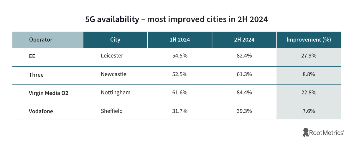 While Virgin Media O2’s results in UK-wide and nation testing remained generally similar to those from 1H 2024, the operator showed improved 5G availability and speeds in most of the cities we tested in 2H 2024.