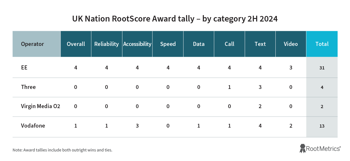 EE won or shared every UK-wide RootScore Award in 2H 2024, including its twenty-third consecutive UK Overall RootScore Award, a period spanning 11.5 years and counting. The operator also earned 31 out of 32 possible Nation RootScore Awards (including ties) across England, Northern Ireland, Scotland, and Wales. Similarly, EE won by far the most awards in major cities with 126 (Vodafone was second with 45).
