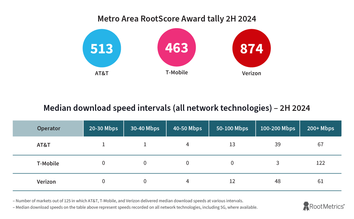 Verizon continued to deliver impressive results across all levels of testing, finishing a strong second in both national and state testing, while leading for awards in major cities and delivering great 5G results. Verizon won our Best 5G Experience prize in 2H 2024, along with victories for both the Fastest 5G and Most Reliable 5G experiences. Verizon took home a whopping 874 Metro Area RootScore Awards across 125 markets tested, a tally significantly higher than those of both AT&T (513) and T-Mobile (463).