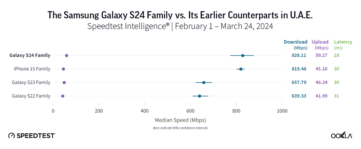 Bottom line: With median 5G download speeds ranging from 639.33 Mbps to 828.11 Mbps, consumers in the U.A.E. will likely enjoy fantastic speeds regardless of device model. However, for current S22 or S23 users hoping to boost their speeds, the Galaxy S24 family stands out as a good choice.