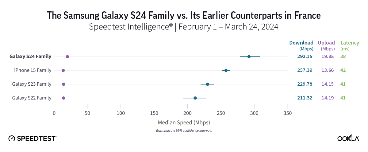 - The Samsung Galaxy S24 family showed a statistically significant lead for median 5G download speeds in seven out of 15 countries in this study. On the other hand, the Apple iPhone 15 family posted the fastest 5G speeds in only one country. It’s worth noting, however, that speed differences between Galaxy S24 devices and iPhone 15’s were relatively minor in some of the countries analyzed (see the charts below for details).