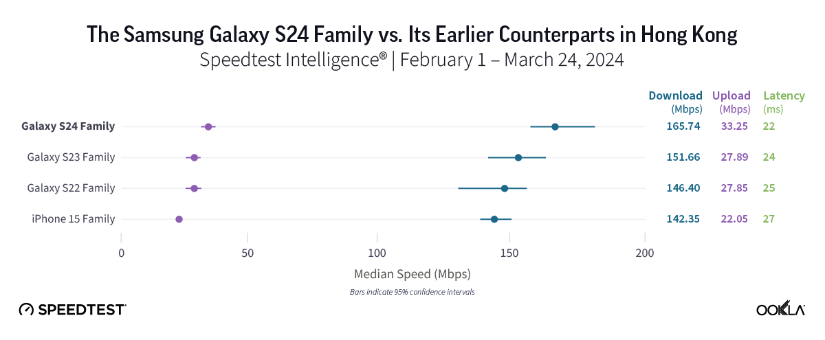 Speedtest Intelligence data revealed strong performance for all device families in Hong Kong, with the new Galaxy S24 family performing particularly well, boasting a median 5G download speed of 165.74 Mbps and the lowest median 5G multi-server latency in the market at 21.74 ms. However, the S24’s median 5G download speed was statistically comparable to that of its older Samsung and iPhone 15 peers, making the choice to upgrade currently more about new features than about performance.