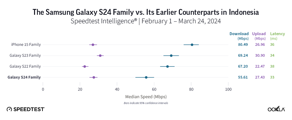 Bottom line: Despite the iPhone 15 providing the top speeds in the market, the Galaxy S24 could hold greater long-term potential for consumers in Indonesia, especially when compared to older Samsung models. Equipped with a newer processor and modem, the S24 could see quicker speeds over time as Indonesia’s 5G networks evolve. In the meantime, users shouldn’t experience notable disparities in speed or latency among all three Samsung device families analyzed.