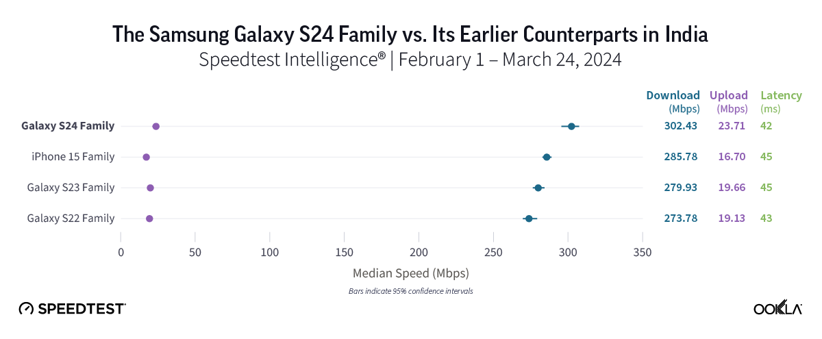 In the early days following the release of the Galaxy S24 series in India, the latest Samsung models led for both 5G download speeds and 5G multi-server latency. While 5G speeds impressed across all device families in India — all notched speeds of at least 273.78 Mbps — Galaxy S24 models posted the top median 5G download speed at 302.43 Mbps and the lowest median 5G multi-server latency at 41.56 ms. On the other hand, Galaxy S22 devices showed the slowest — but still impressive — speeds in India at 273.78 Mbps, while the Samsung Galaxy S23 was just a tick behind at 279.93 Mbps. The iPhone 15 family, meanwhile, clocked in with a median 5G download speed of 285.78 Mbps.