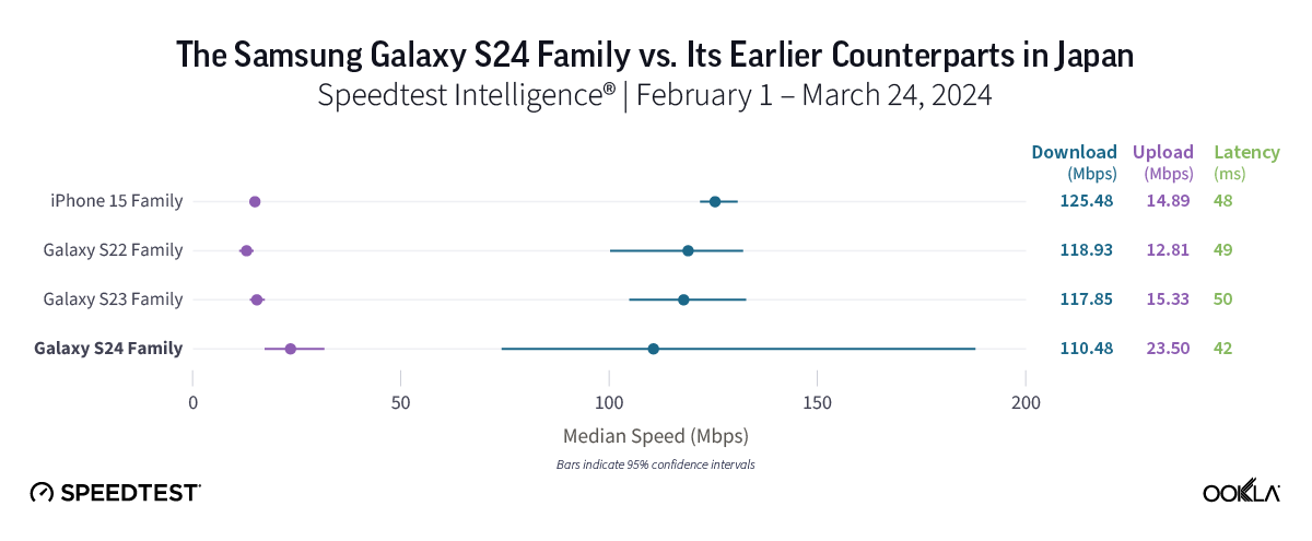 Consumers around the world eagerly awaited Samsung’s release of the latest line of its flagship Galaxy S series of smartphones on February 1, 2024. Was the wait worth it? In this article, we analyze how the Samsung Galaxy S24 family measures up against its predecessors in terms of 5G speed and latency during its first several weeks on the market (February 1 – March 24, 2024).