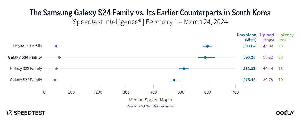 Bottom line: 5G users in South Korea can expect remarkable 5G speeds across the board, regardless of their device. However, Samsung Galaxy loyalists who currently use S22 models might want to consider moving to an S24 model, given that the S24 family was over 100 Mbps faster than Galaxy S22’s, while also offering the top median 5G upload speed in the market at 55.22 Mbps. For users who prioritize the fastest 5G experience, Galaxy S24’s and iPhone 15’s are both worth a look.