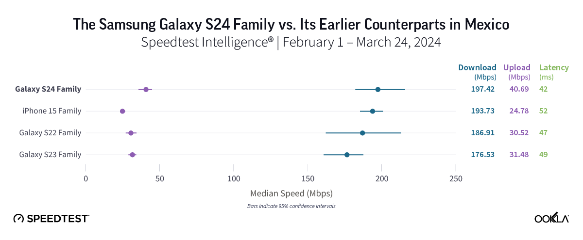 Bottom line: For users eager to embrace the new features offered by Galaxy S24 devices or move on from S23 devices, an upgrade might be worthwhile. However, with fast 5G speeds across all device families in Mexico and only about 20 Mbps separating all four device families in our study, users likely won’t see a major change in their 5G experience by upgrading.
