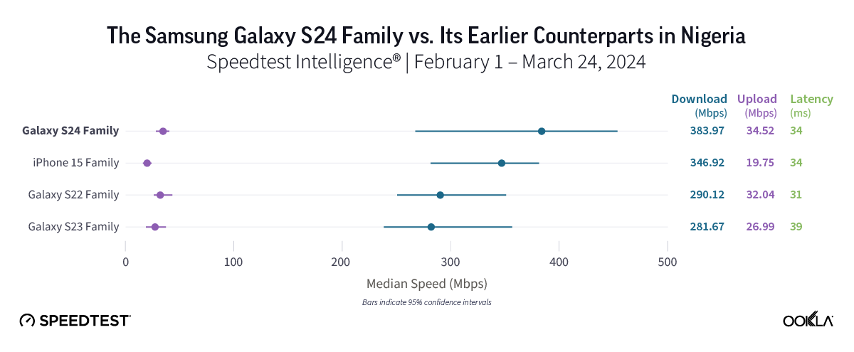 In Nigeria, 5G speeds were impressive overall, from the Galaxy S23 family’s median 5G download speed of 281.67 Mbps to the new Galaxy S24’s speed of 383.97 Mbps. However, in these early days of the S24 lineup’s release, we are still waiting to see how things stabilize in the market before we can make a firm recommendation on whether to upgrade.