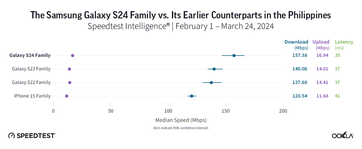 Samsung Galaxy S24 users in the Philippines might have noticed a modest improvement to their 5G speeds compared to those on older S23 and S22 models since they upgraded, as the Galaxy S24 family’s median 5G download speed of 157.38 Mbps was about 20 Mbps faster than that of Galaxy S22’s (137.68 Mbps) and a little over 15 Mbps faster than the Galaxy S23 family (140.06 Mbps). Meanwhile, the iPhone 15 family’s median 5G download speed of 120.04 Mbps trailed all three Samsung Galaxy families in the market.