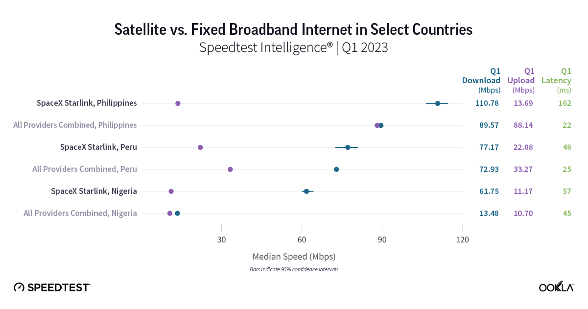 Speedtest Intelligence data shows new Starlink data in three countries during Q1 2023, including Nigeria, Peru, and the Philippines, where Starlink is still a nascent provider with limited market share. Median download speeds for new Starlink countries were: 110.78 Mbps in the Philippines, 77.17 Mbps in Peru, and 61.75 Mbps in Nigeria during Q1 2023.