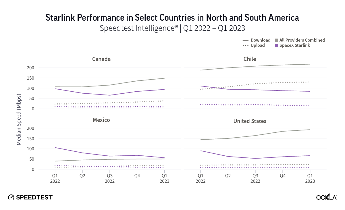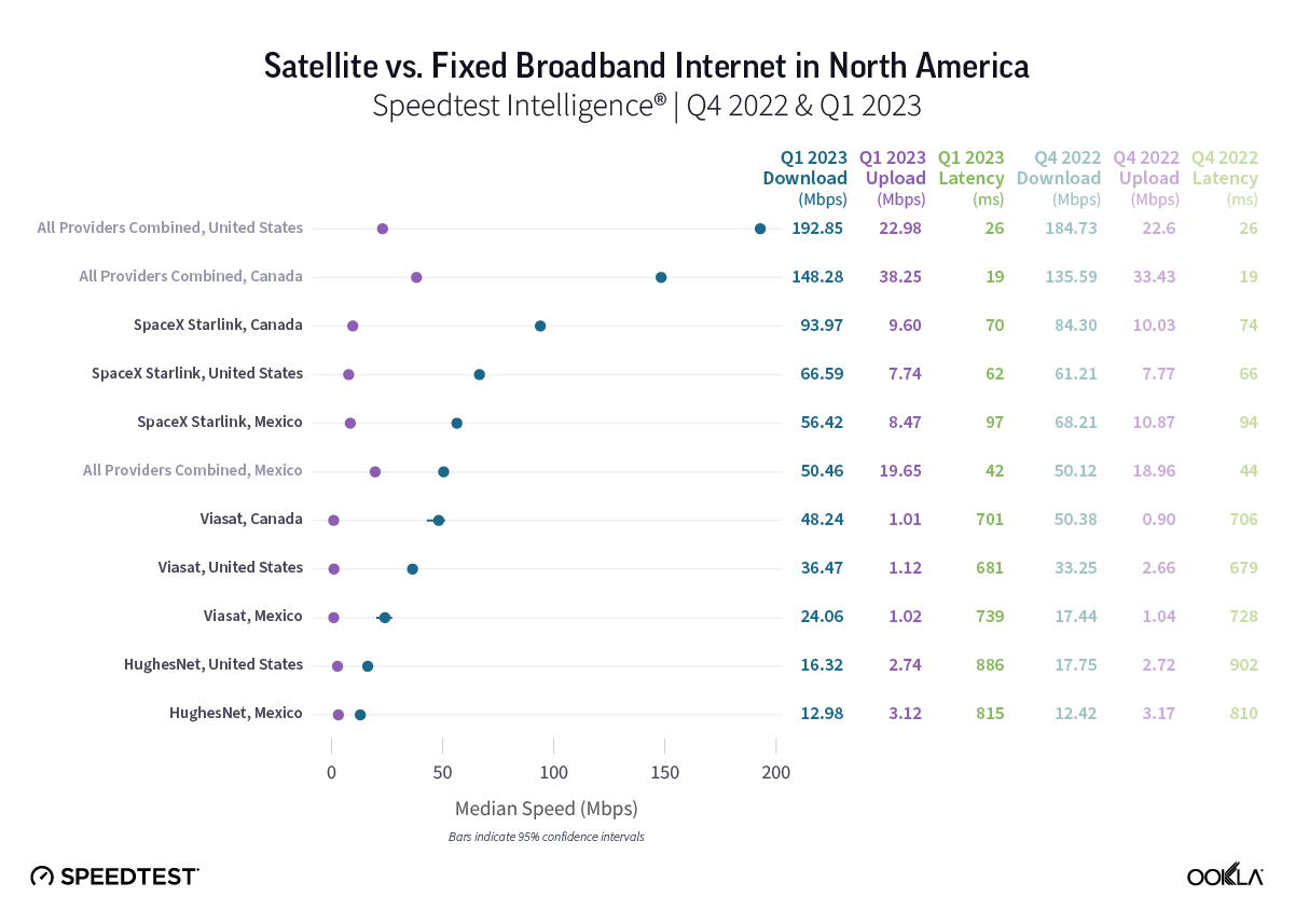 Satellite internet competition is heating up and Ookla® has exciting, fresh data from Q4 2022 and Q1 2023 for HughesNet, SpaceX’s Starlink, and Viasat in North America, South America, and the Caribbean, as well as new Starlink markets we haven’t yet featured in our ongoing satellite internet series.