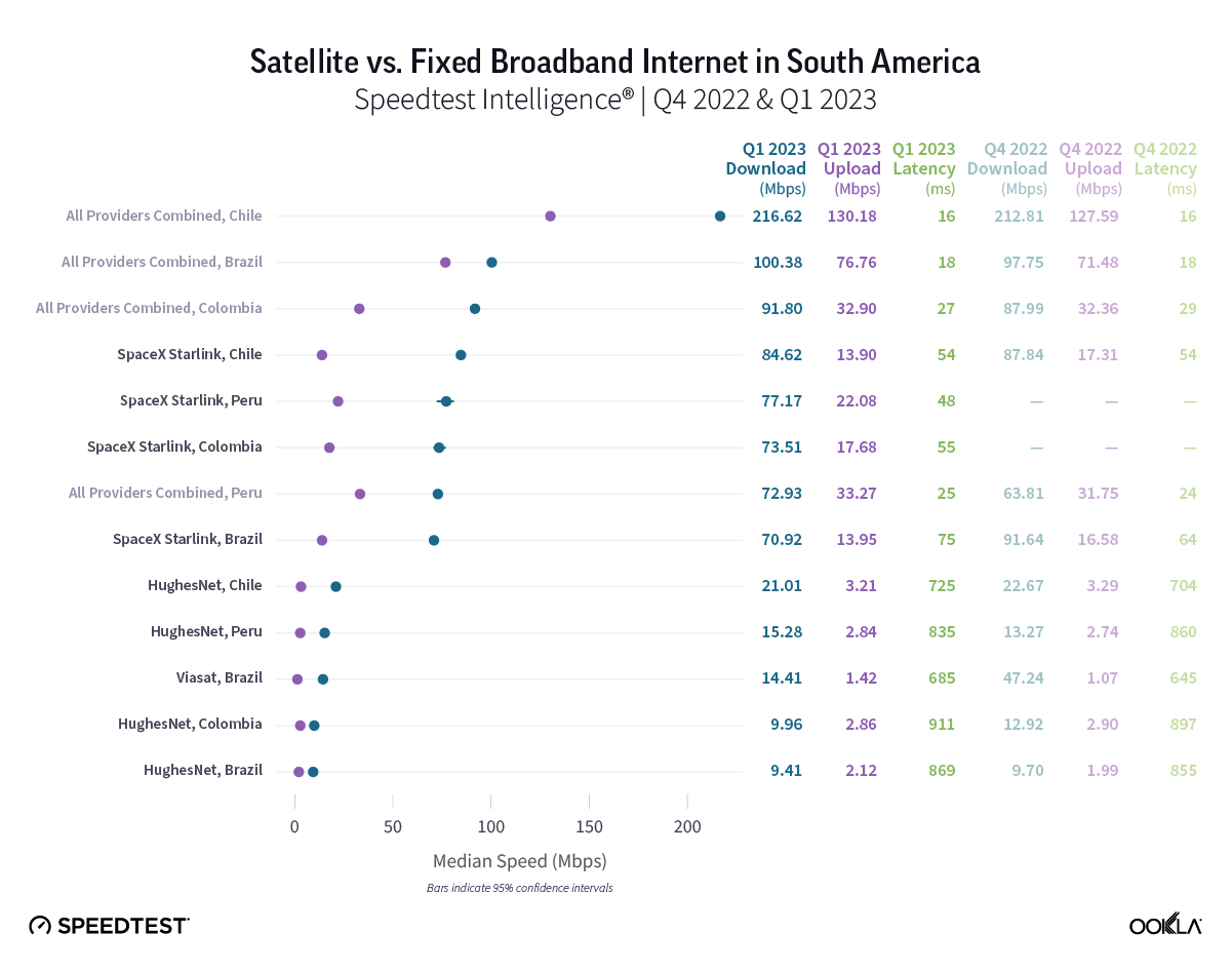 Starlink in Chile was the fastest satellite provider in South America during Q1 2023, edging out Starlink in Peru by about 5% with a median download speed at 84.62 Mbps to 77.17 Mbps. No satellite provider outperformed all fixed broadband providers combined in Q1 2023, but Starlink in Colombia and Brazil both reached median download speeds above 70 Mbps at 73.51 Mbps and 70.92 Mbps, respectively. HughesNet in Chile broke 20 Mbps at 21.01 Mbps, while Viasat in Brazil only reached 14.41 Mbps.